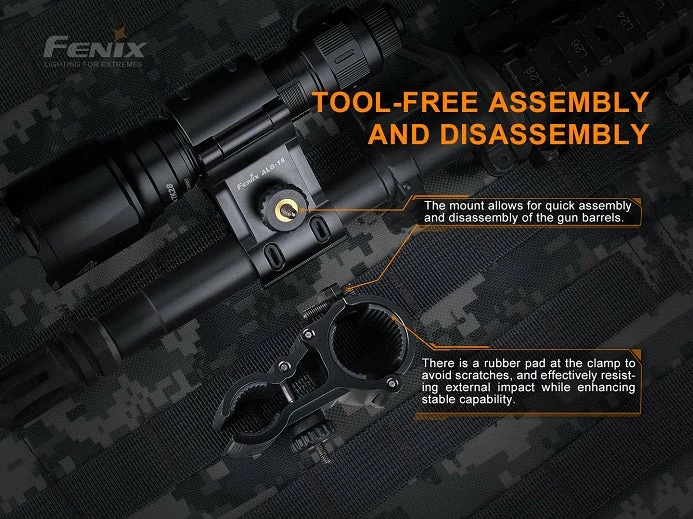 The ALG-18 is a tool free quick assembly heavy-duty barrel mount that fits most Fenix flashlights with a diameter of 1″. The ALG-18 includes a rubber pad at the clamp for increased stability. Made from A6061-T6 Aluminum with Type HAIII hard-anodized finish the ALG-18 is a great durable option for barrel mounting your Fenix light