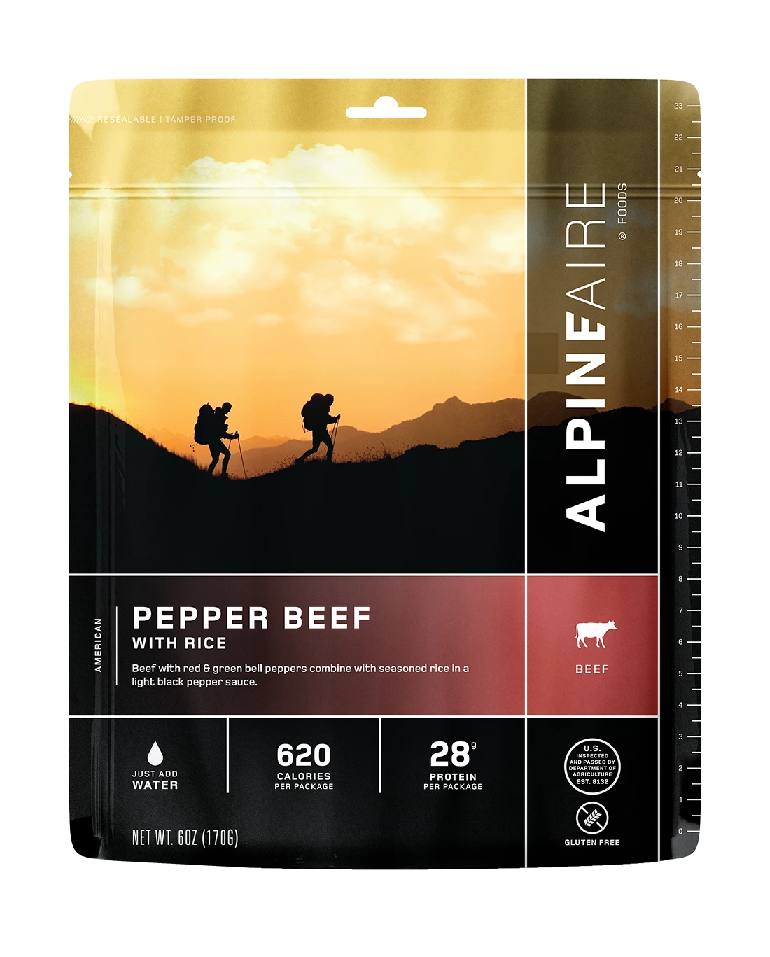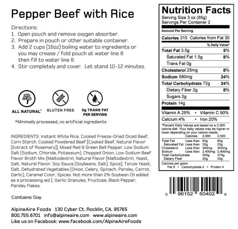 Spicy beef with green and red peppers with seasoned rice accented with black pepper.