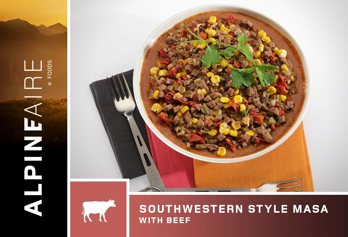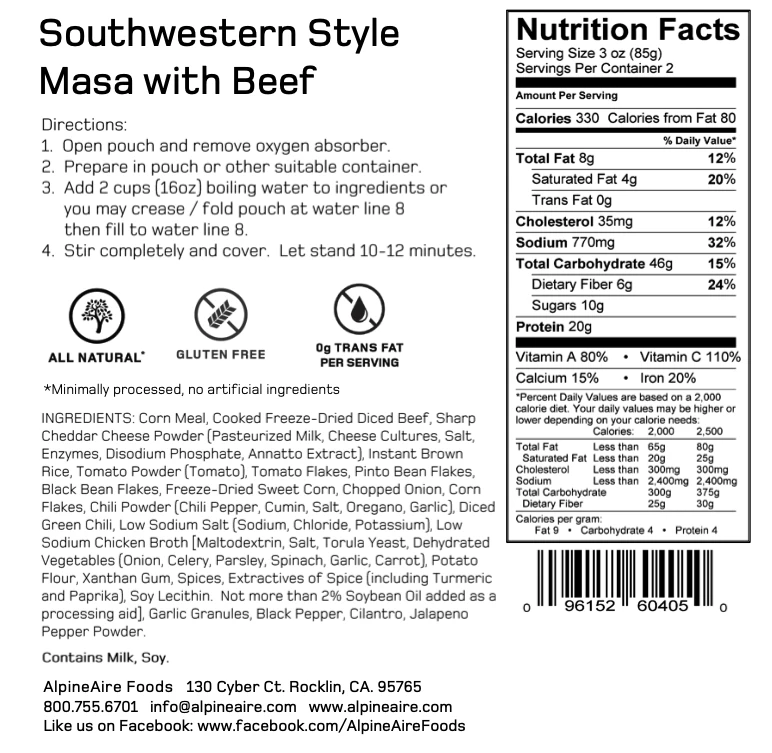 Beef and beans with cornmeal, cheddar cheese, brown rice, and vegetables including corn, onion, spinach, and carrots with Tex-Mex seasonings.
