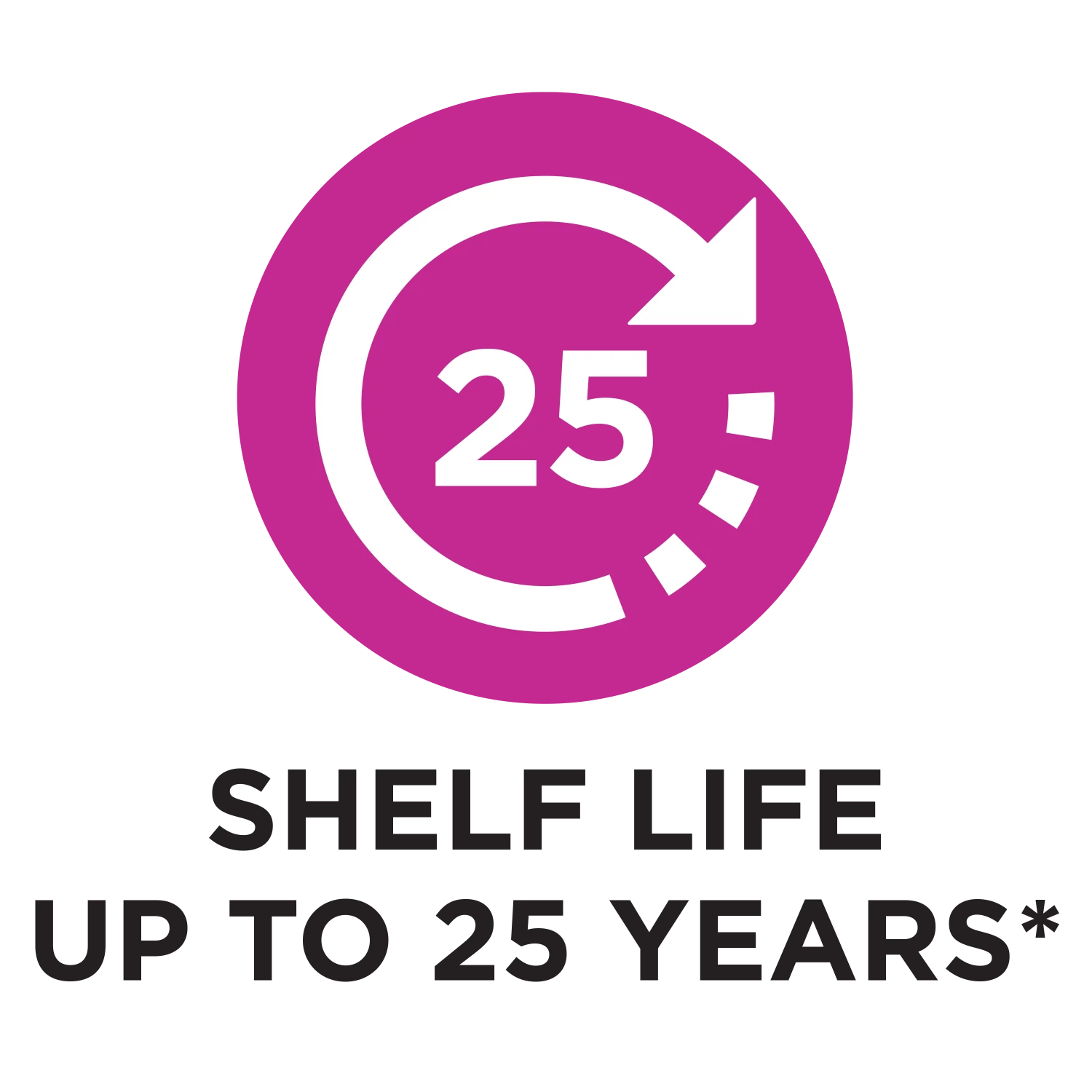*Shelf life up to 25 years when unopened. Best when stored in a cool and dry place at temperatures between 55°F and 70°F. Actual shelf life may vary based on individual storage conditions.