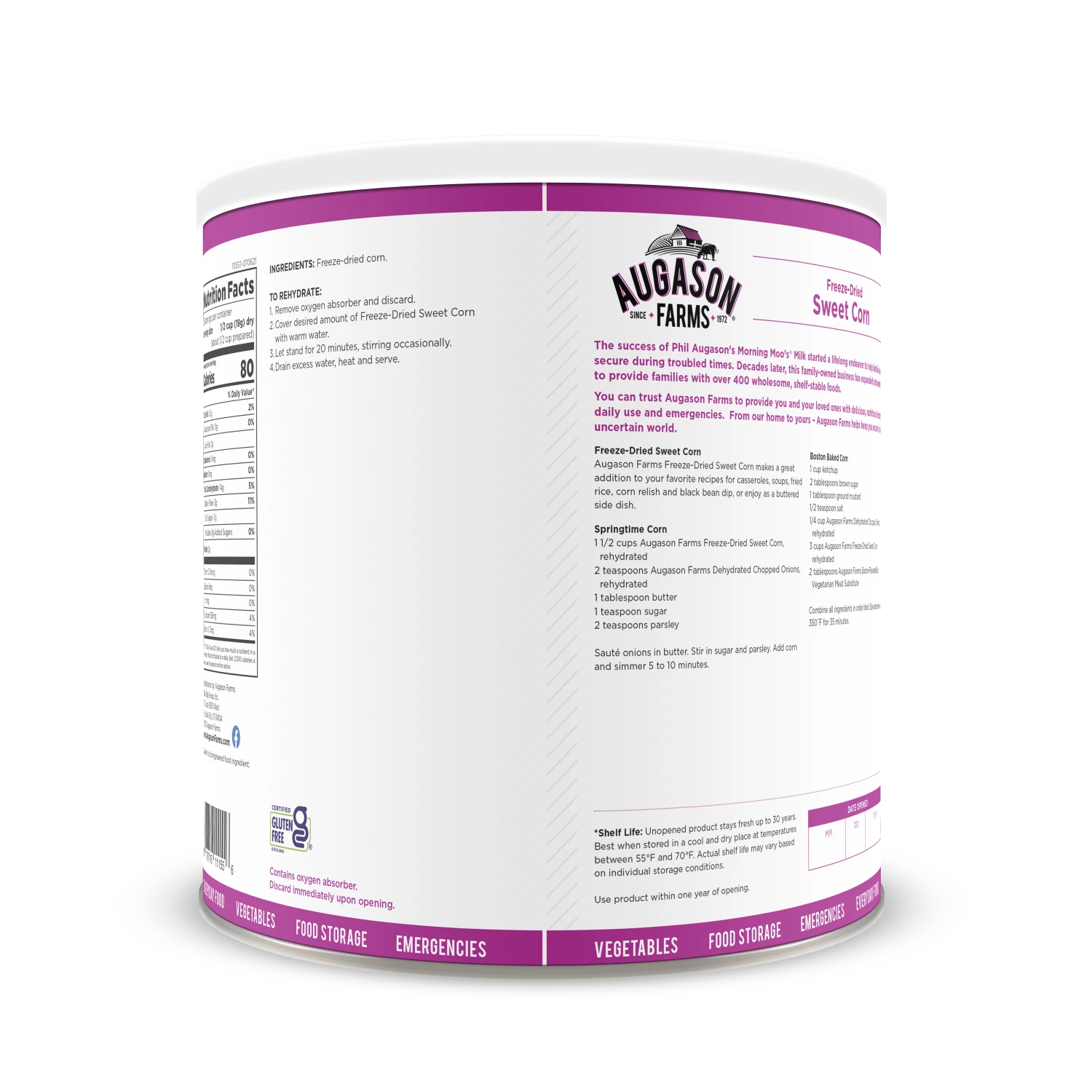Augason Farms Freeze Dried Sweet Corn offers a unique and convenient option for keeping corn on hand for everyday use or for your long term emergency food supply. This freeze dried vegetable can be eaten straight out of the can as a crisp finger food with a hint of sweetness, used as a crunchy topping for salads or tacos, or can even be used in veggie trail mixes for hiking, camping, or on-the-go snacks. It can also be easily reconstituted for use as a fresh side dish or in recipes like soups, chili, casseroles, and more. Augason Farms Sweet Corn is certified gluten free.