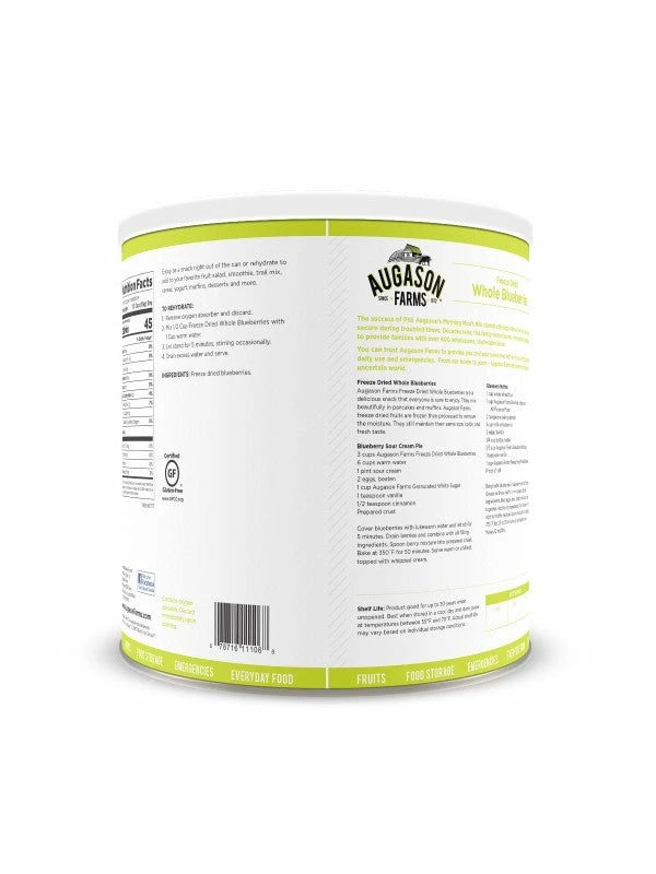 Augason Farms offers a variety of healthy freeze dried fruits you will be excited about, like these scrumptious Freeze Dried Whole Blueberries. Rehydrate them with a little water and enjoy them in pancakes, muffins, cheesecake or to add flavor to your granola. They’re also great for 72 hour kits and long term food storage.