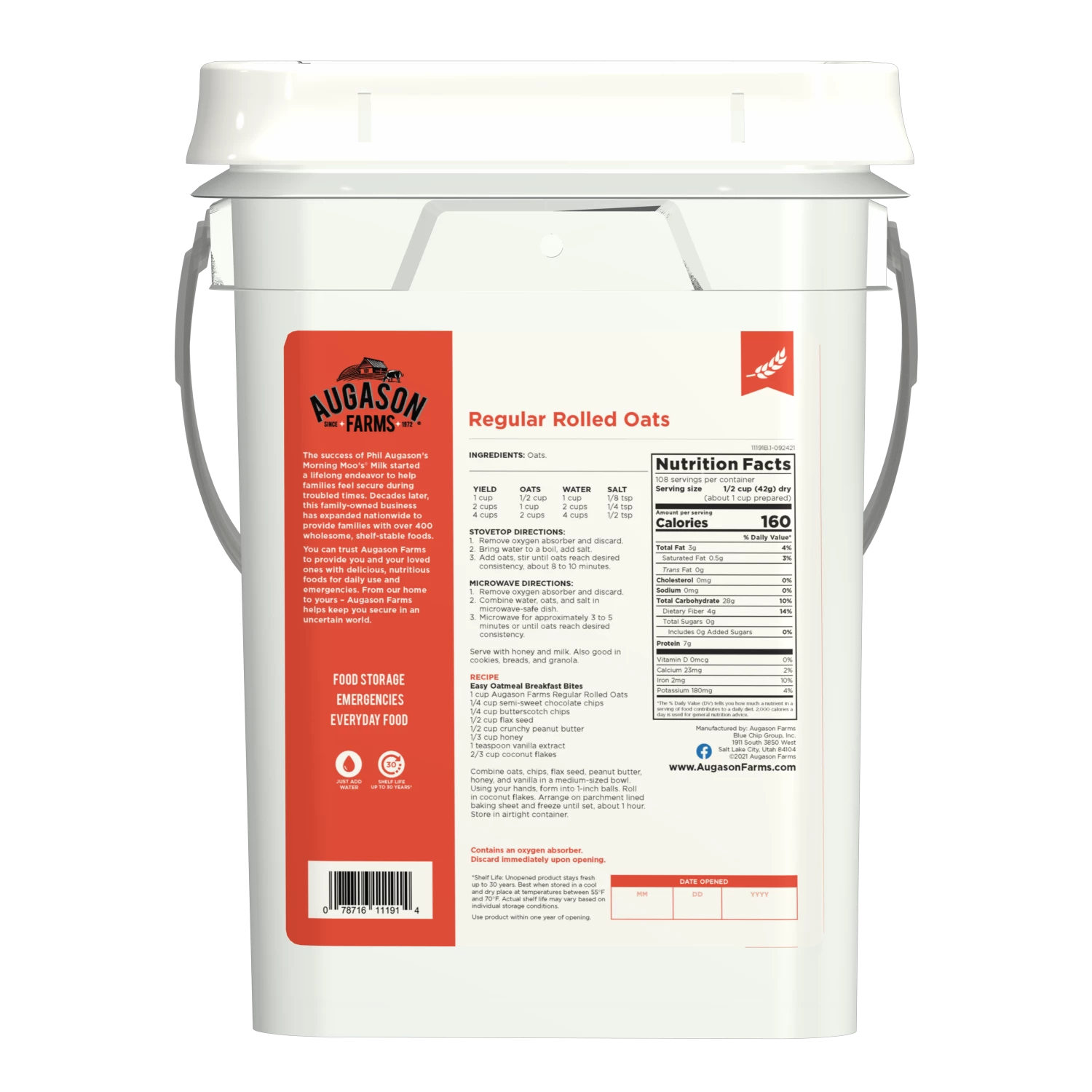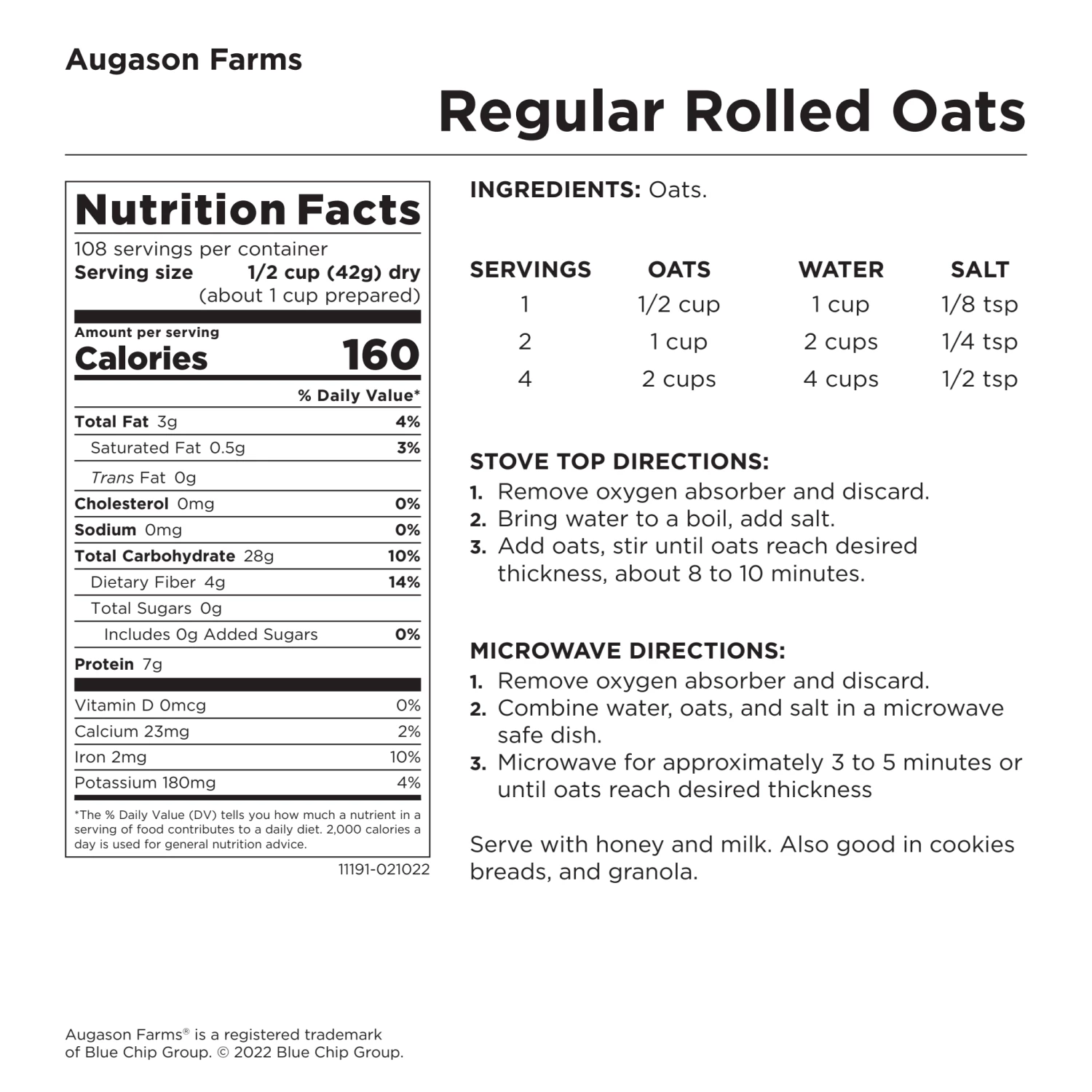 Regular Rolled Oats are the perfect whole grain food for baking or for a hot breakfast cereal. Top it with any Augason Farms freeze dried fruit for a delicious start to your day. Oats are recognized for helping to reduce cholesterol, and they are loaded with vitamins and minerals. Not only are Regular Rolled Oats an exceptional choice for food storage, they are perfect for everyday use as well.