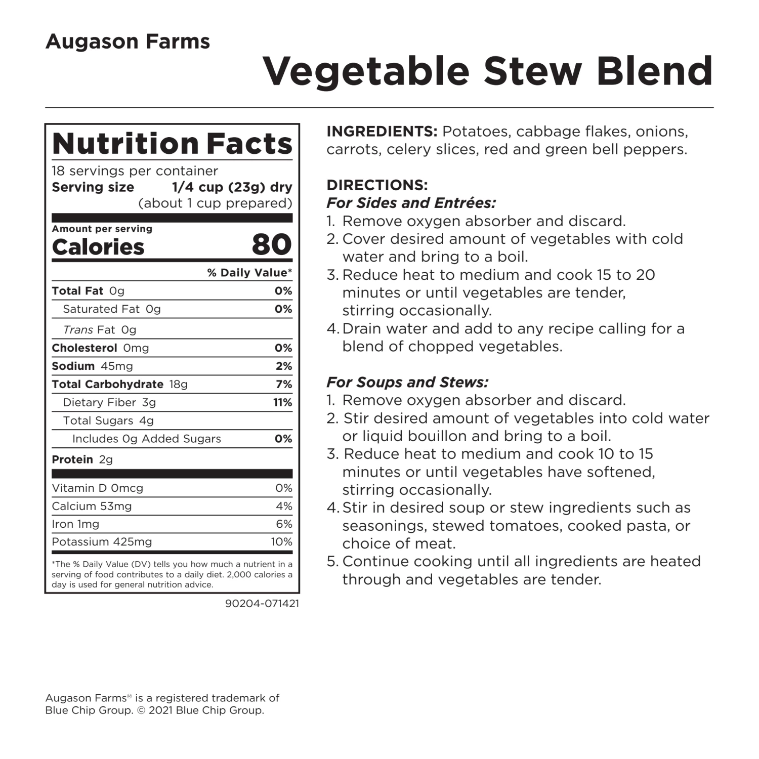 This blend is perfect for getting a variety of healthy vegetables into your diet. Potato dices, chopped onions, carrot dices and cabbage flakes are only some of the wonderful ingredients found in our Vegetable Stew Blend. Just add the indicated amount of water and reconstitute these tasty ingredients. Add them to your favourite soups, stews and casseroles.