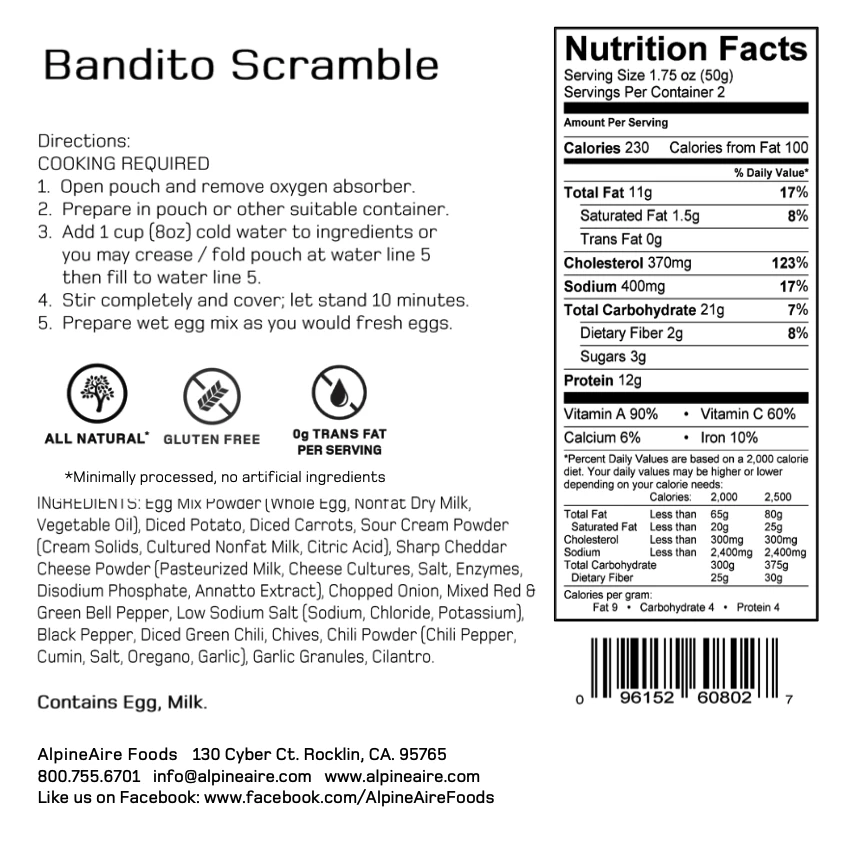 Scrambled egg mix with potatoes, cheddar cheese, mild chilies and spices to liven up your morning. Cooking Required.