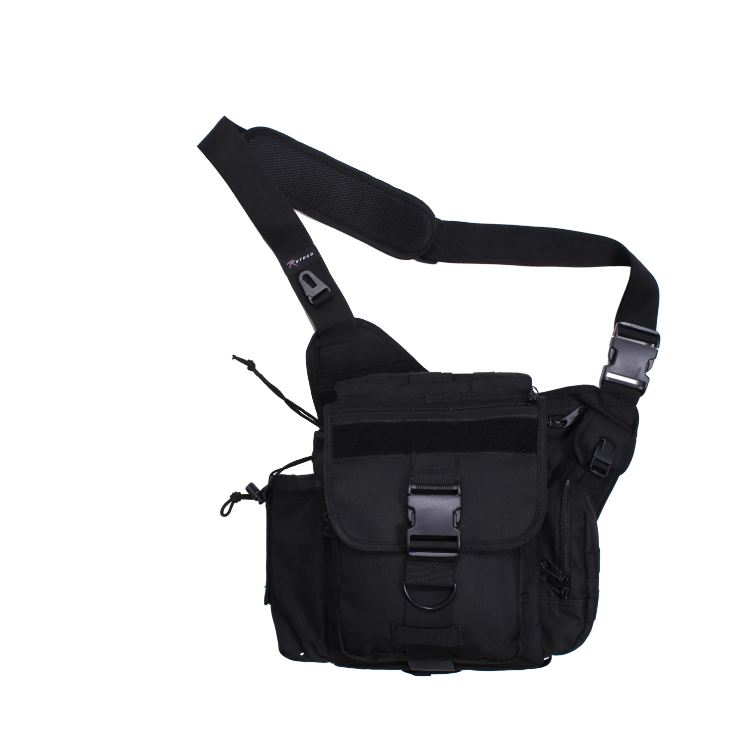 Rothco’s XL Advanced Tactical Shoulder Bag is made of durable denier polyester. The MOLLE compatible tactical shoulder bag features 5 versatile pouches: a small zippered side pouch, top zippered pouch, front zippered pouch, large side pouch with drawstring closure, and exterior cell phone pouch. This tactical shoulder bag has a 2” wide adjustable padded shoulder strap with a quick-release buckle and 2 inside pockets. These survival bags also feature 2 pen holders and three padded areas on the back of the bag.