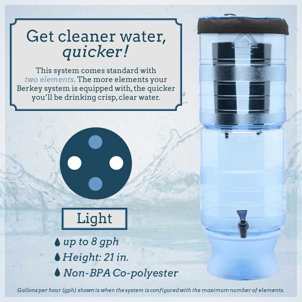 - This Berkey Light System comes standard with 2 Black Berkey Purification Elements but can be expanded up to 4 elements