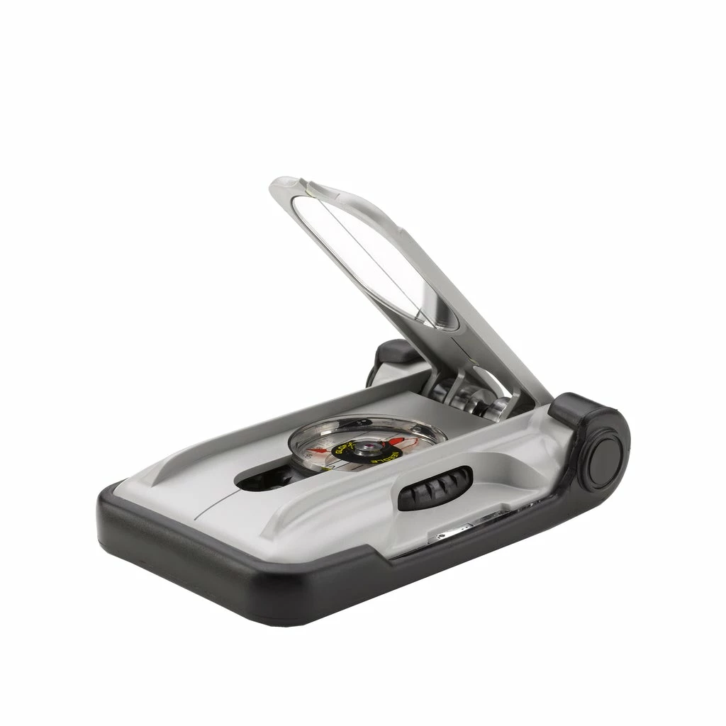 Our most advanced baseplate compass with sighting mirror, quick-reference lid, and protective rubber foot that stores reference cards with an array of scales.
