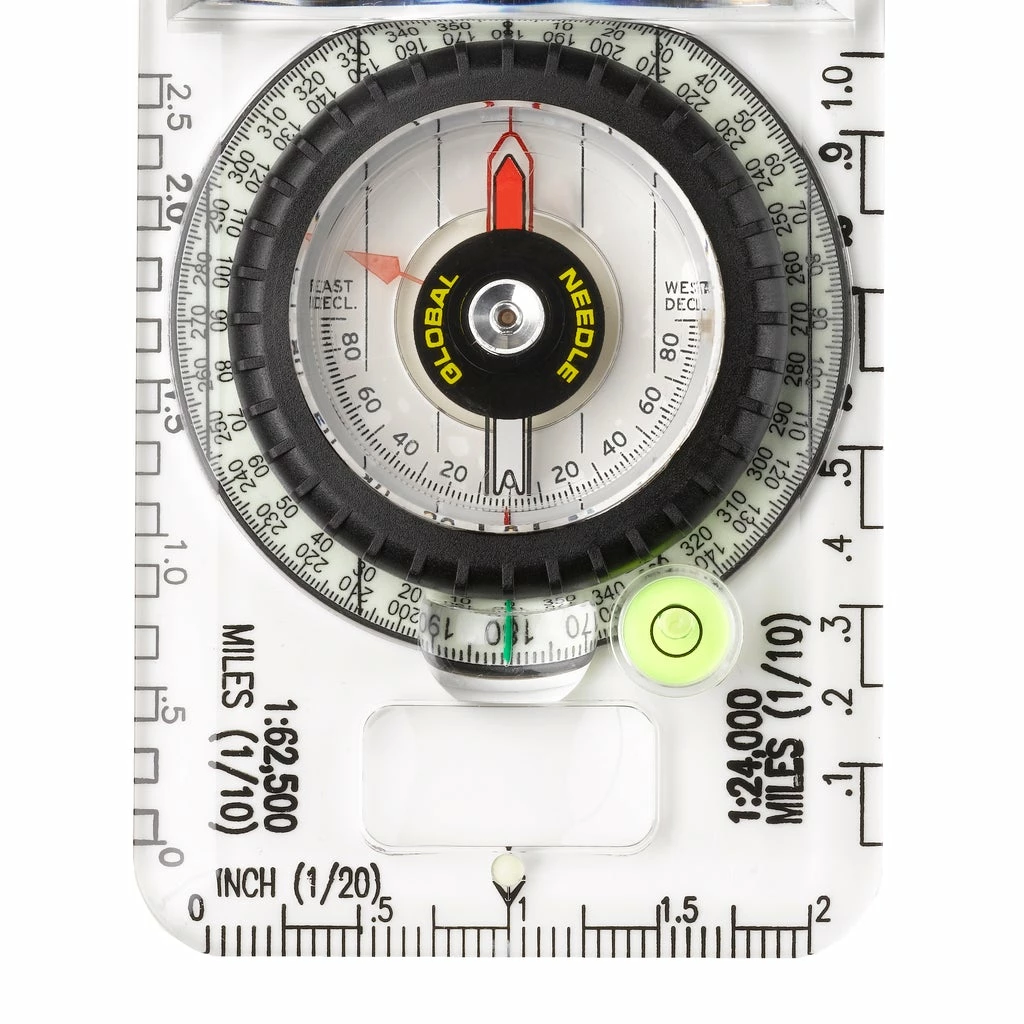 - Bubble level for absolute precision readings; keeping the compass level (not the needle level) is a critical aspect for taking accurate bearings