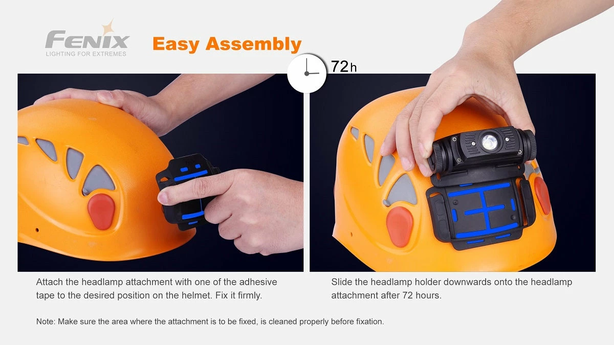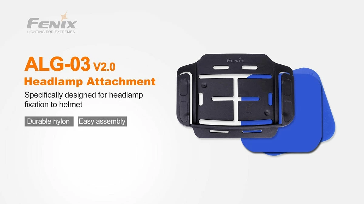 The Fenix ALG-03 V2.0 Headlamp Helmet Mount allows you to quickly attach and detach the HL55 or HL60R headlamp to many different outdoor/work helmets—making sure the headlamp stays securely fixed to your helmet. Now you can adjust the light angle without worrying about the headlamp slipping or having to readjust positioning on your helmet. Attach the mount easily with the included adhesive tape, then slide your headlamp into the durable nylon mount.