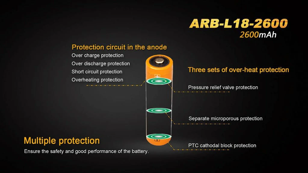 The Fenix ARB-L18-2600 is a high capacity 18650 Li-ion rechargeable with a protection circuit in the anode to help prevent short circuits, over charge/discharge and over heating. The battery also includes pressure relief vents which expel waste gas in the rare case of an internal short circuit preventing an explosion.