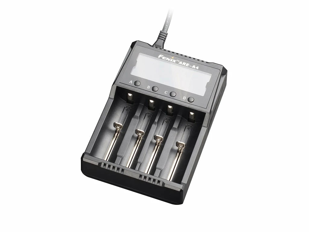 Charge up to 4 batteries at the same time with the new Fenix ARE-A4 Battery Charger. This amazing 4-channel battery charger is compatible with a multitude of batteries including 10440, 14500, 16340, 18650, 21700 and 26650 batteries. You can also charge Ni-MH and Ni-Cd AA, AAA, and C batteries. You can have peace of mind when you use the all-new ARE-A4 charger since it provides 4 layers of security for safe use including short-circuit, over-current, over-voltage, and reverse polarity protection. Additionally, you can view the most current battery charging setting on the ultra bright LCD screen. Single clicks on the charger button allow you to cycle through charging specs including battery voltage, charging current, and charging time. A long press or click will turn off the LCD screen. The Fenix ARE-A4 is compatible with both AC and DC charging so you can charge batteries at home or on the go in your car. The DC charging adapter cable is sold separately.