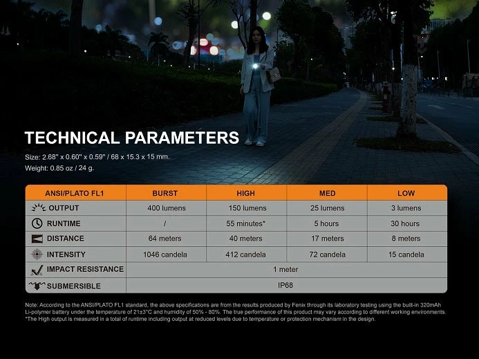The Fenix E05R flashlight is a rechargeable mini flashlight that can emit up to 400 lumens from its built-in 320mAh Li-polymer battery. Fully rechargeable via a built-in micro USB charging port, the flashlight has a maximum runtime of 30 hours. This little flashlight is built tough with an IP68 dustproof and waterproof rating. Super small and compact, this keychain flashlight is a great choice for everyday carry.