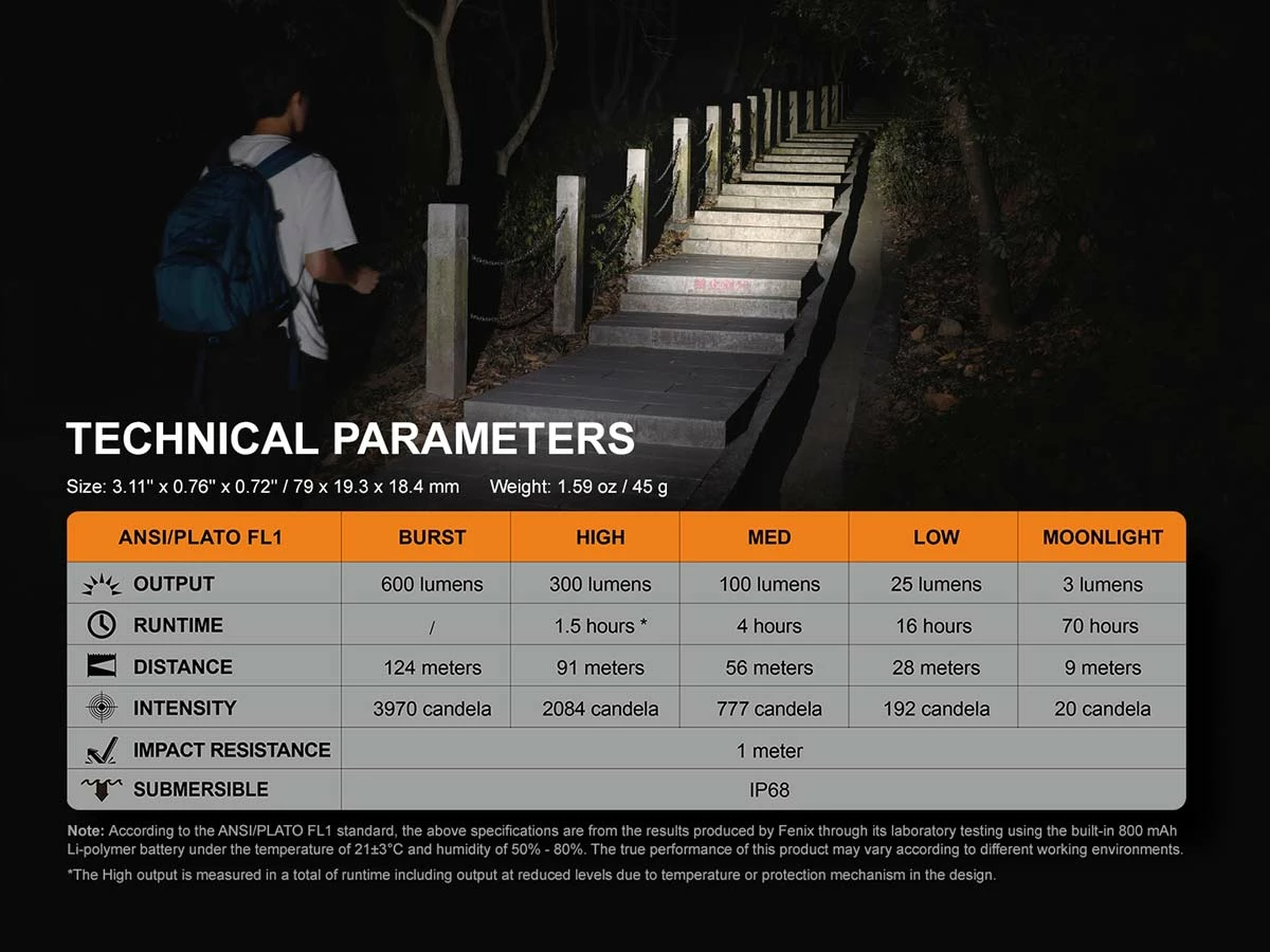 The Fenix E09R Rechargeable Flashlight is the perfect everyday carry companion. At only 3.1” long and less than 1” round, this small flashlight can easily light up your surroundings. The side switch lets you cycle through four brightness levels including a Moonlight mode for up-close tasks that can last up to 70 hours. And when even more light is needed choose the Burst mode for a short 600 lumen burst of light. The built-in battery is USB Type-C rechargeable and the port is creatively hidden beneath the head to maintain appearance and create a dustproof and waterproof seal. Perfect for your pocket or your keychain, the Fenix E09R offers maximum illumination in a small EDC size.