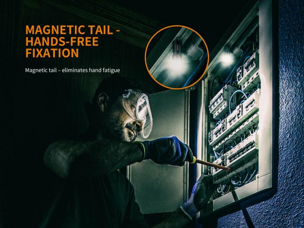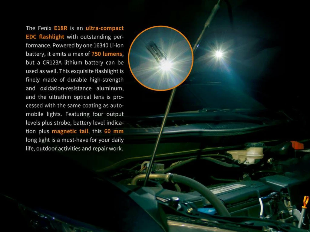 The Fenix E18R is an ultra-compact EDC flashlight with outstanding performance. Powered by one 16340 Li-ion battery, it emits a max of 750 lumens, but a CR123A lithium battery can be used as well. This exquisite flashlight is finely made of durable high-strength and oxidation-resistance aluminum, and the ultrathin optical lens is processed with the same coating as automobile lights. Featuring four output levels plus strobe, battery level indication plus magnetic tail, this 6 cm long light is a must-have for your daily life, outdoor activities and repair work.