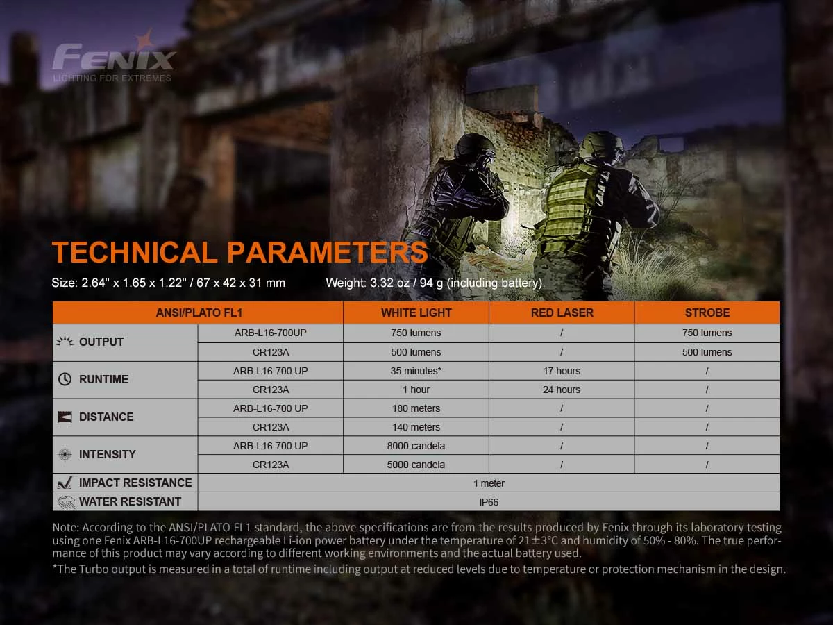 The Fenix GL22 is a versatile tactical mounted light that features a broad range of options. Featuring a Luminus SST20 LED + Red Laser, the GL22 has a maximum output of 750 lumens using the supplied 700UP battery or max 500 lumens when using a CR123A. The GL22 comes supplied with a GL and 1913 ( Picatinny) rail plate to mount on rail-equipped hardware. Key features of the GL22 light are ambidextrous switches used to access the white light and red laser and a momentary-on feature can also be used with either switch. The GL22 is compatible with Glock and Picatinny rails.