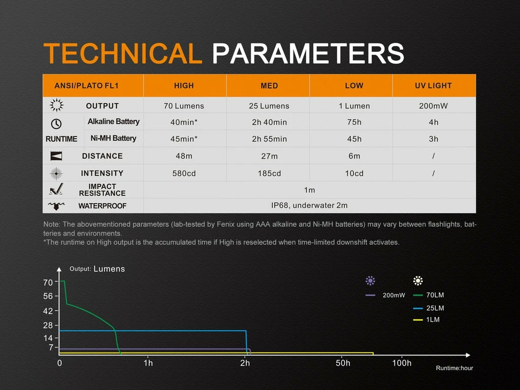 | ANSI FL1 Rating | High (Ni-MH / Alkaline) | Medium (Ni-MH / Alkaline) | Low (Ni-MH / Alkaline) | UV (Ni-MH / Alkaline) |