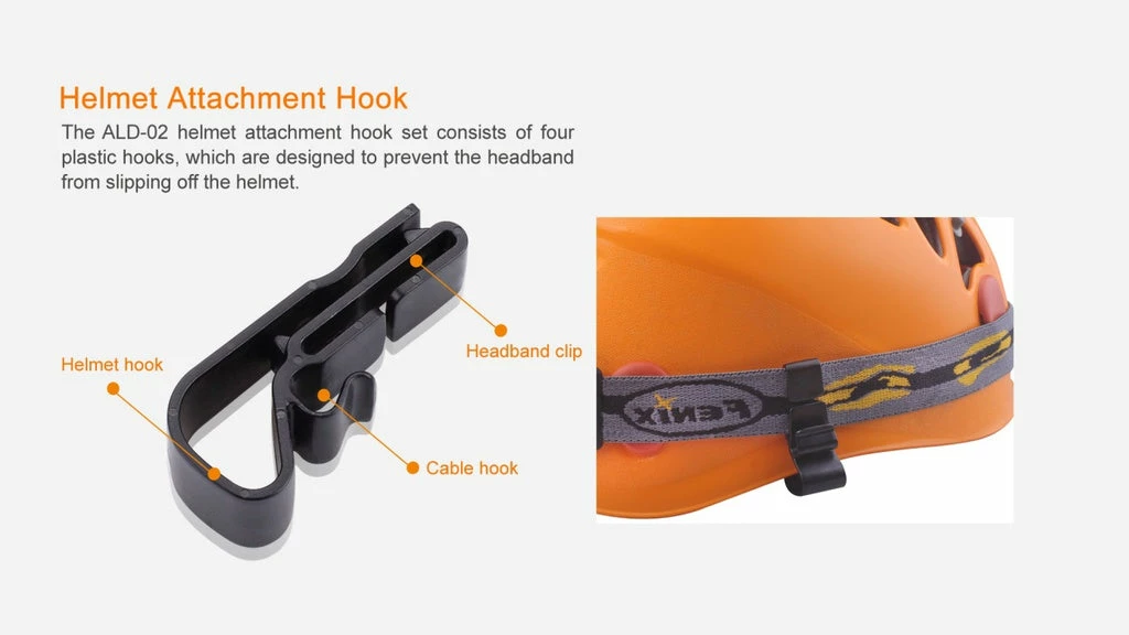 The Fenix ALD-02 Helmet Headlamp Attachment Hooks are designed to keep your headband firmly on helmet. ALD-02 consists of four plastic hooks, which are designed to prevent the headband from slipping off the helmet and with easy assembly. It is also made with environmentally friendly PC material!