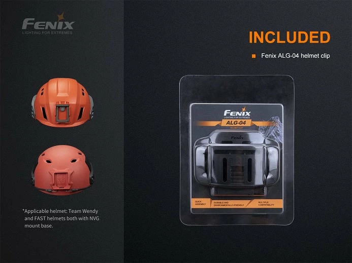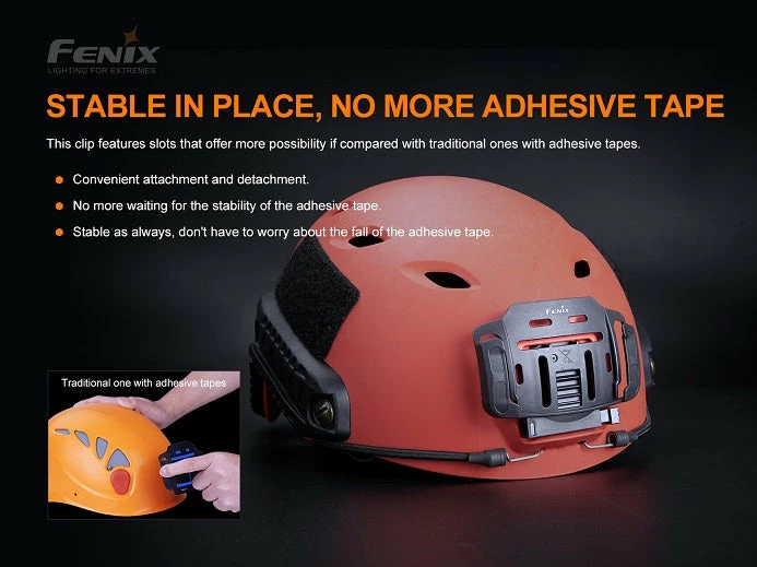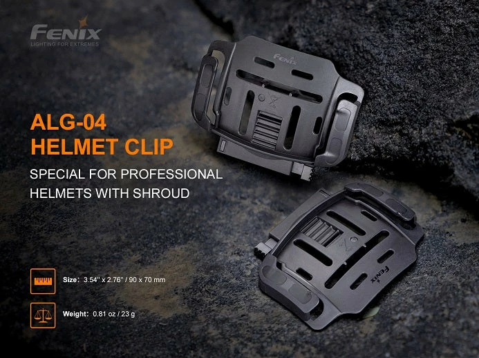 Fenix ALG-04 helmet clip is specifically designed for headlamp attachment to outdoor or industrial work helmets with NVG mount base. It enables easy and convenient attachment and detachment of headlamp to and from the helmet and allows adjustment of the lighting angle of the headlamps.