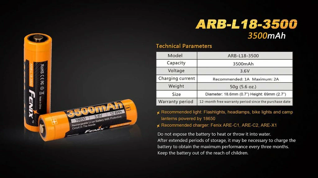 The Fenix ARB-L18-3500 is a high capacity 18650 Li-ion rechargeable battery with a protection circuit in the anode to help prevent short circuits, overcharge/discharge and overheating. The battery also includes pressure relief vents that expel waste gas in the rare case of an internal short circuit preventing an explosion.