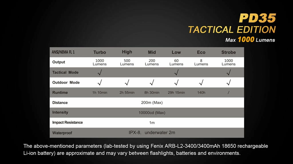 Designed with the military and law enforcement professionals in mind, this flashlight is measured at less than 14cm (5.5 inches) long and features up to 1000 lumens in turbo output while throwing it’s beam a distance up to 200 meters. In Outdoor Mode, the PD35 TAC delivers six output modes including a variable strobe. Switch to the new Tactical Mode to activate rear-switch only operation for fast, simplified mode selection of momentary, turbo, low and strobe. The PD35TAC is powered by two CR123A or single rechargeable 18650 batteries (not included)