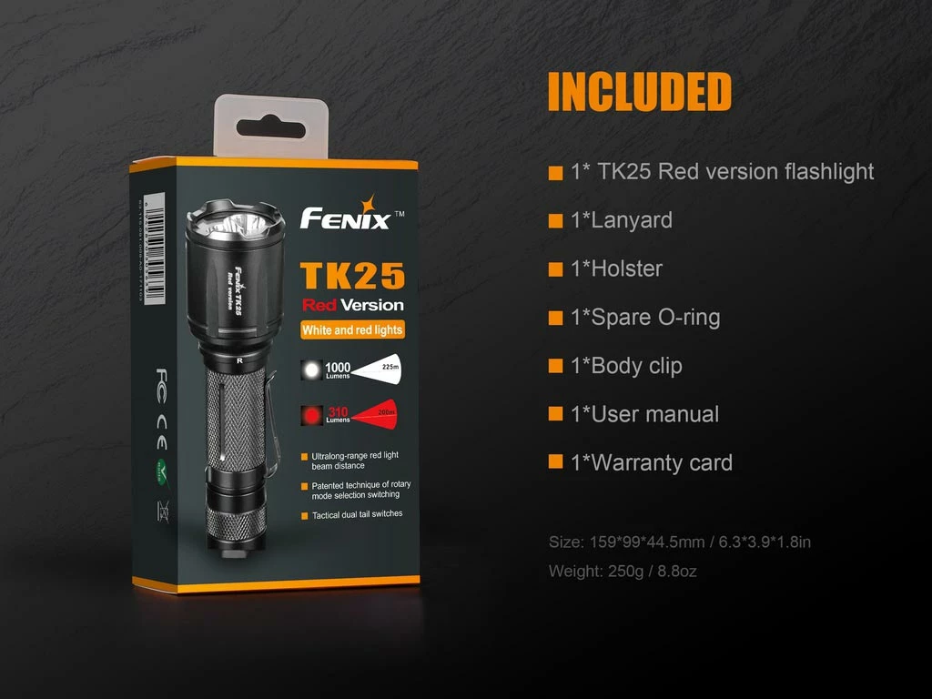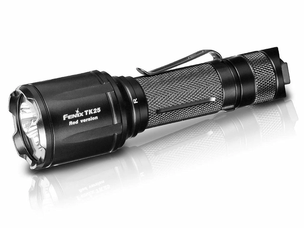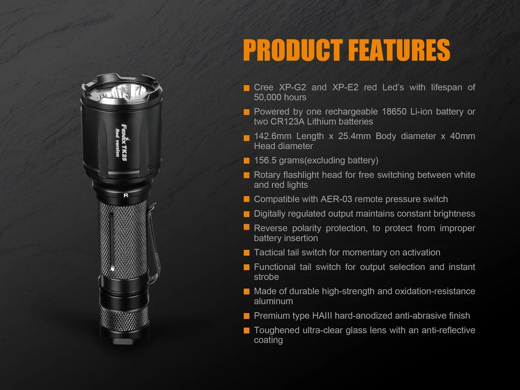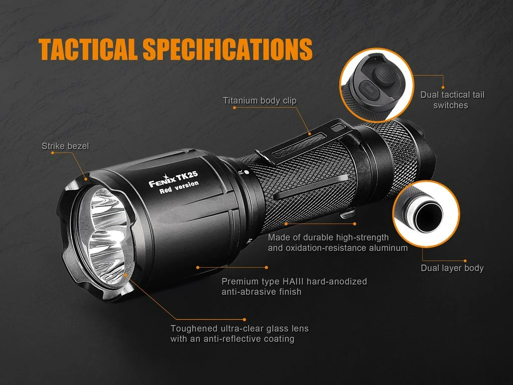 The TK25 Red version is specifically designed for hunting. It upholds the innovative mode switching structure which allows easy switching between the white and red lights by infinitely turning the flashlight head in either direction. This method of mode switching optimizes lighting output and effectiveness. It is fitted with CREE XP-G2 white LED’s, and red Cree XP-E2 LED’s. The white light delivers a max output of 1000 lumens and beam distance of 225 meters, the red light delivers a max of 310 lumens and beam distance of 200 meters. The light is powered by one 18650 Li-ion battery but is also compatible with cold-resistant CR123A batteries. The two tactical tail switches are for output selection and strobe activation.