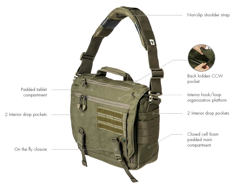 This conveniently designed Summit Side Satchel provides extra storage that works with your other carrying gear for maximum efficiency. Top haul handle, a reliable internal hook/loop mounting platform, and a hidden back CCW pocket make this satchel one of a kind and perfect for your tactical demands.