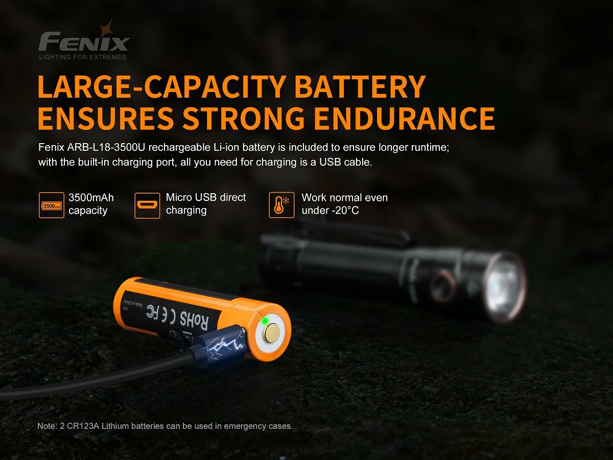 - Two cold resistant CR123A Lithium batteries can be used for emergency in place of the 18650