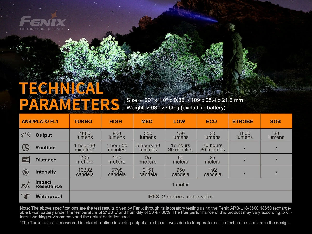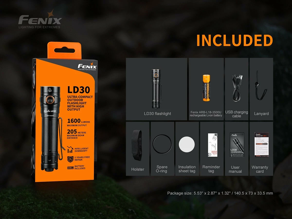 The Fenix LD30 is a high performing small and lightweight outdoor flashlight with tail switch. Operated on a single 18650 rechargeable Li-ion battery (ARB-L18 3500U included), the LD30 emits five output levels allowing for various scene applications. It also include two-position body clip and battery level indicator, which enhance daily usage in outdoor activities and industrial tasks.