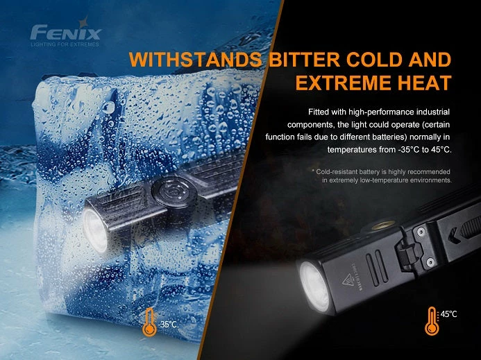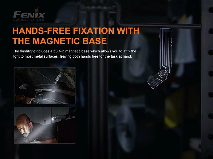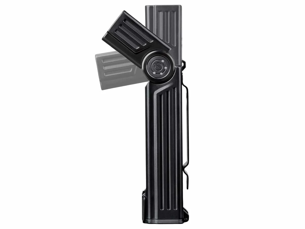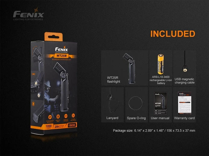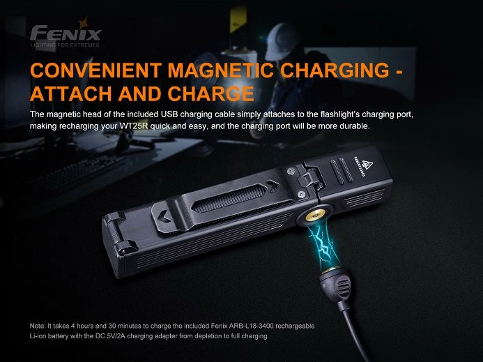 The Fenix WT25R rechargeable pivoting flashlight is specifically designed multifunctional workhorse for industrial maintenance operations. What makes the WT25R special is the ability to angle the head of the flashlight up to 105deg, allowing for multiple lighting directions. The pivoting head is perfect for hand-free use; you can choose to tail stand the light, use the heavy-duty body clip to hold the flashlight in your pocket or attach the flashlight to a nearby metal surface via its magnetic tail. The WT25R features magnetic charging with a included 3400 mAh rechargeable Li-ion battery. The Fenix WT25R LED work light will become your favourite tool to use around the house or on the job.