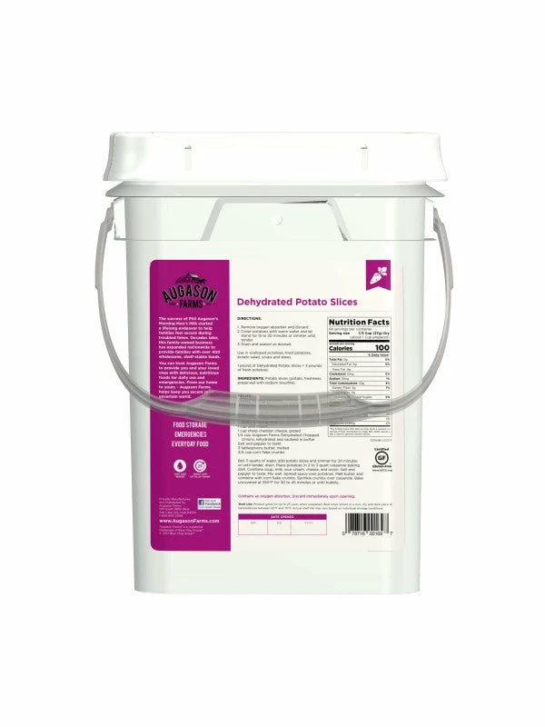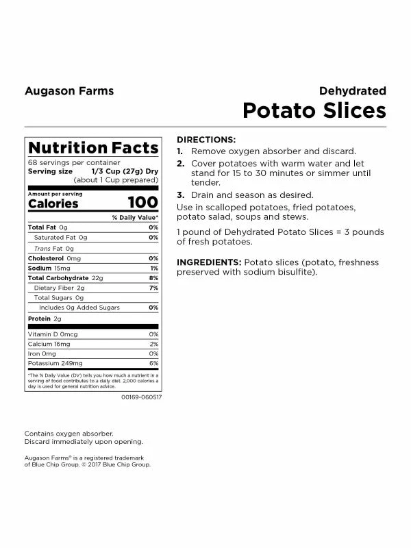 Dehydrating food is something Augason Farms knows a lot about. Our Dehydrated Potato Slices easily combine with other Augason Farms dehydrated vegetables to provide a nutritious, great tasting meal. Dehydrated Potato Slices are a great addition to any family’s survival food storage. And, they’re certified gluten free.