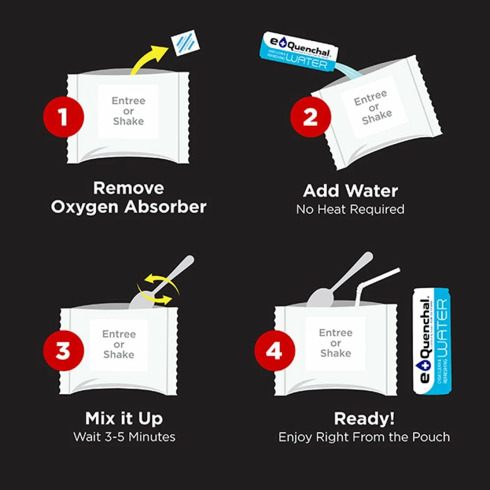 MEALS ARE EASY TO PREPARE and do not require emergency or camping cookware. Farmhouse Potatoes and Maple Brown Sugar Oatmeal are prepared by adding water to the pouch, stirring, and letting stand for three to four minutes. The Protein Shake is prepared by adding water and stirring until dissolved. Enjoy meals straight from the pouch and drink the extra water to help you stay hydrated.