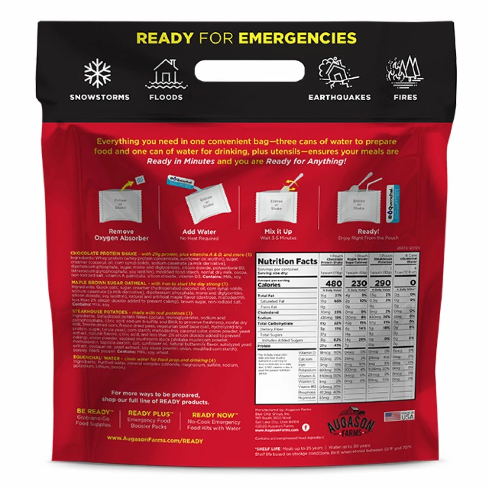 MEALS ARE EASY TO PREPARE and do not require emergency or camping cookware. Steakhouse Potatoes and Maple Brown Sugar Oatmeal are prepared by adding water to the pouch, stirring, and letting stand for three to four minutes. The Protein Shake is prepared by adding water and stirring until dissolved. Enjoy meals straight from the pouch and drink the extra water to help you stay hydrated.