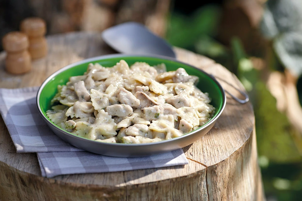 A smooth creamy white wine sauce, savoury chunks of braised oven-baked pork, and wild mushrooms are served on a generous portion of bow pasta. This dish will please both gourmet and food-lovers alike. A pure delight to be enjoyed without moderation!