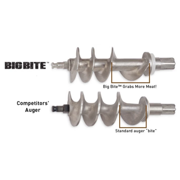 Our exclusive Big Bite technology allows the auger to take an extra big bite of meat and then move it into the grinder head quicker than other grinders. The benefit? You grind larger cuts of meat faster without clogging up the machine! A premium grind in half the time!