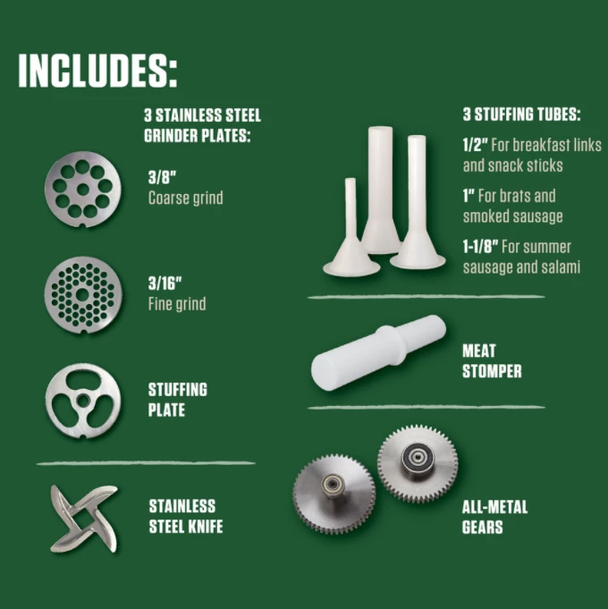 All stainless steel motor housing, all metal gears with roller bearings, heavy duty handle for easy moving, 110 volt, permanently lubricated motor with improved grease formulation to reduce motor noise, built-in circuit breaker, stainless steel knife, head, auger and large meat pan, stainless steel coarse (3/8 in) and fine (3/16 in) plates, 3 stuffing tubes (1/2 in, 1 in, 1-3/8 in OD), and meat stomper.