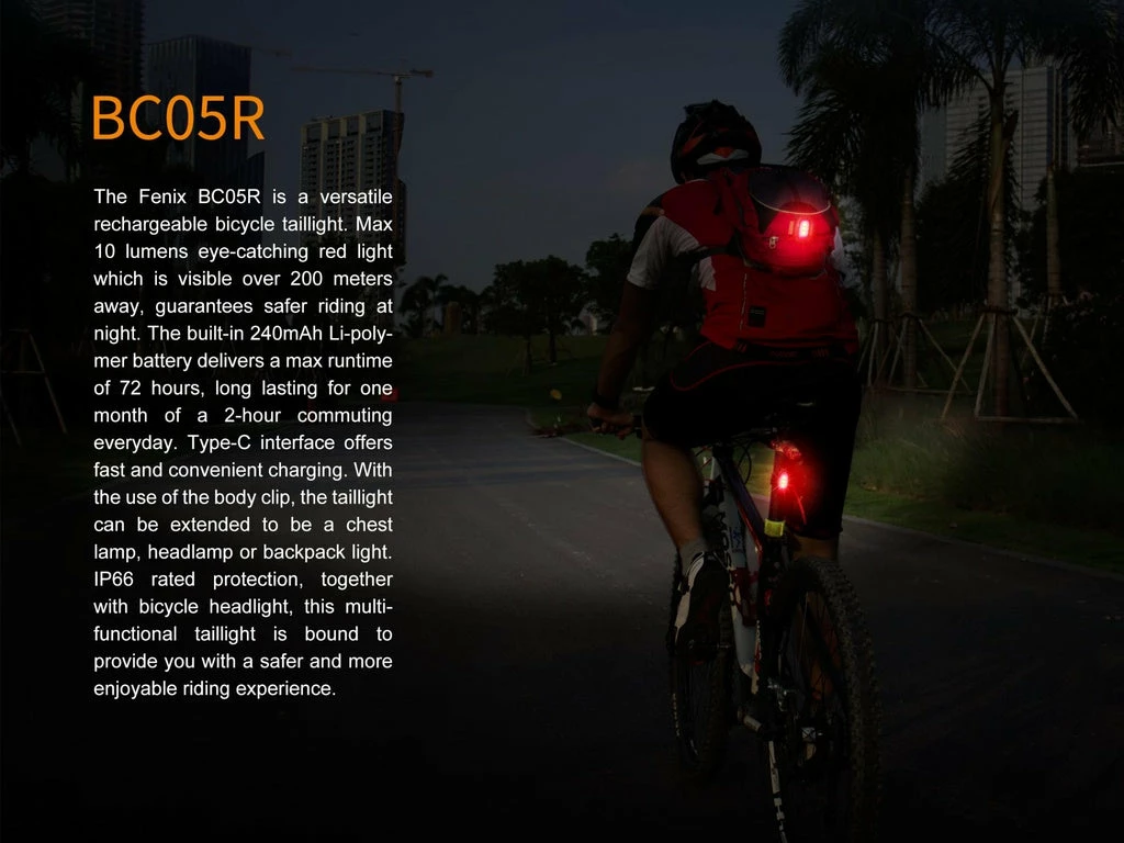 The Fenix BC05R is a versatile rechargeable bicycle taillight. Max 10 lumens eye-catching red light which is visible over 200 meters away, guarantees safer riding at night. The built-in 240mAh Li-polymer battery delivers a max runtime of 72 hours, long lasting for one month of a 2-hour commuting everyday. USB Type-C interface offers fast and convenient charging. With the use of the body clip, the taillight can be extended to be a chest lamp, headlamp or backpack light. IP66 rated protection, together with bicycle headlight, this multifunctional taillight is bound to provide you with a safer and more enjoyable riding experience.