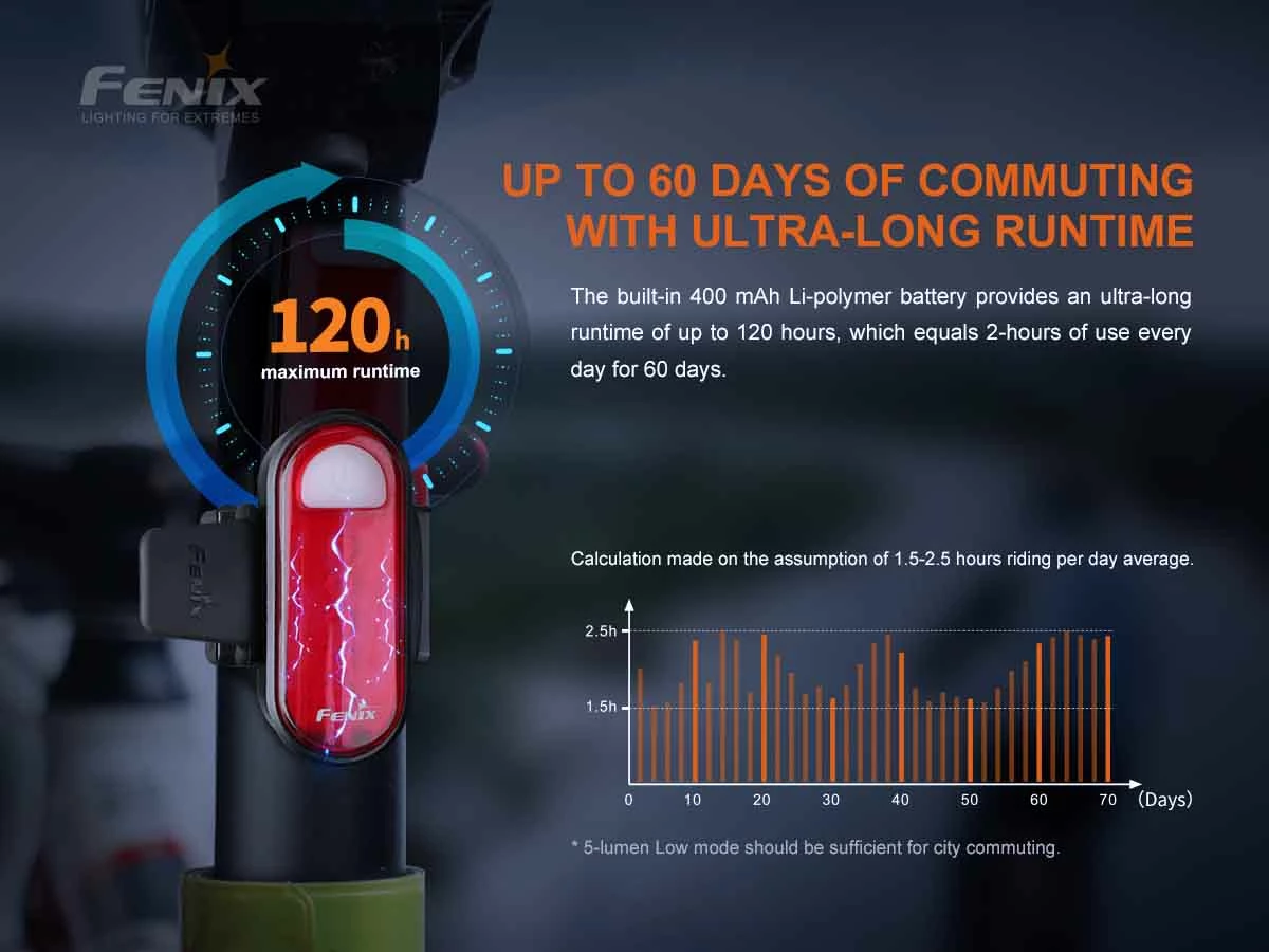The Fenix BC05R V2.0 is an ultra-compact rechargeable bicycle tail light with an eye-catching red light built for cycling commuters and mountain bikers. Being seen from a distance in traffic with 15-lumen red light and 180 degree lighting angle will help make your bicycle commute much safer and will provide peace of mind. Quickly charge the BC05R V2.0 via the USB Type-C interface, the built-in 400mAh Li-polymer battery delivers a max runtime of 120 hours. With the included body clip, the versatile tail light can be used as a headlamp, chest lamp or backpack light.