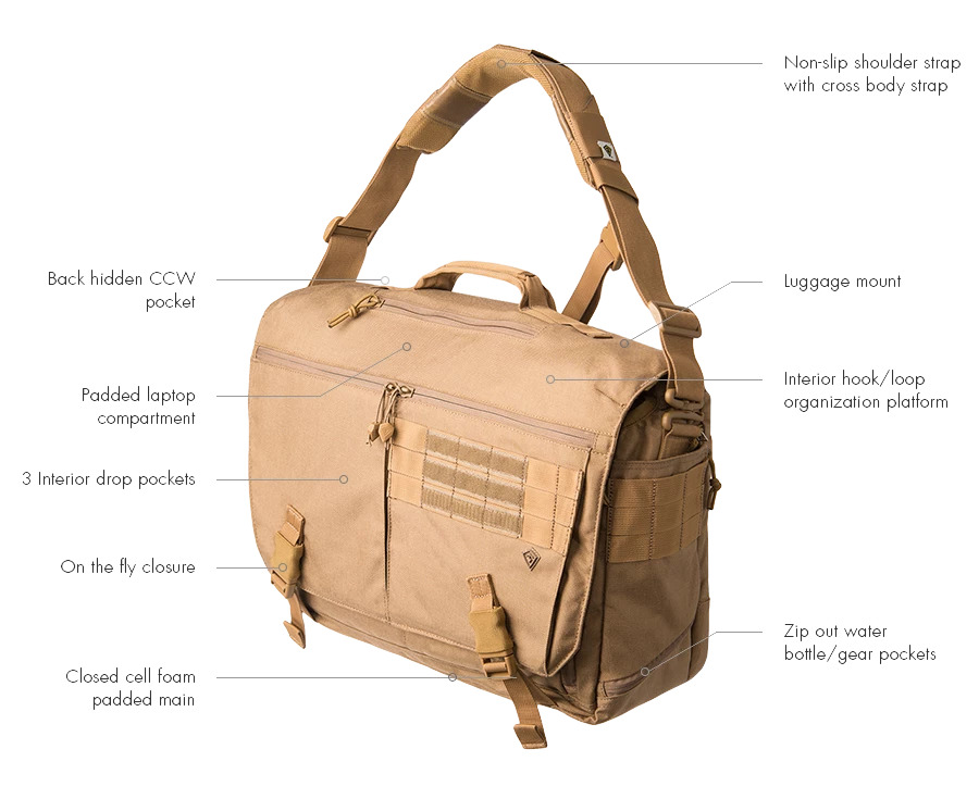 This messenger style office-to-field bag is designed to provide all of the room and durability you require to carry out your duty. The nylon fabric and premium YKK hardware give you a sturdy exterior you can rely on. Foam padded main and computer compartments keep items separate and protected, while three inner drop pockets and zip out water bottle/gear pockets provide extra storage space with organization. These features, along with the hidden CCW pocket, set this case apart from other tactical bags.