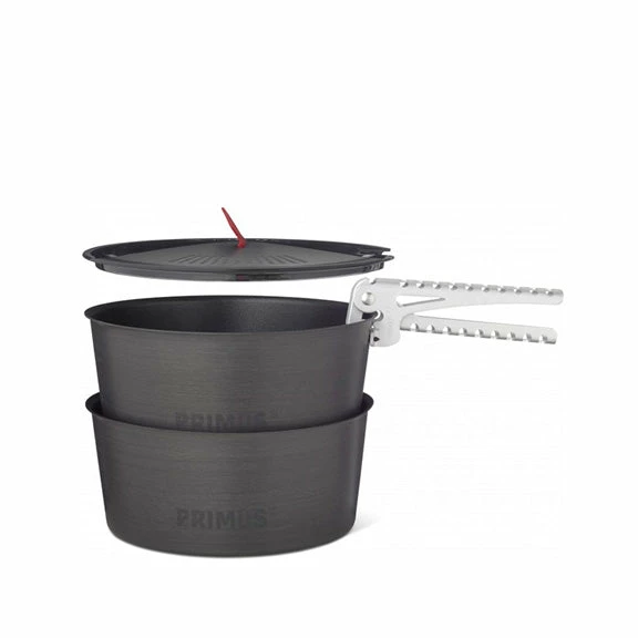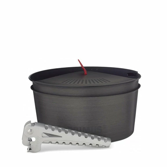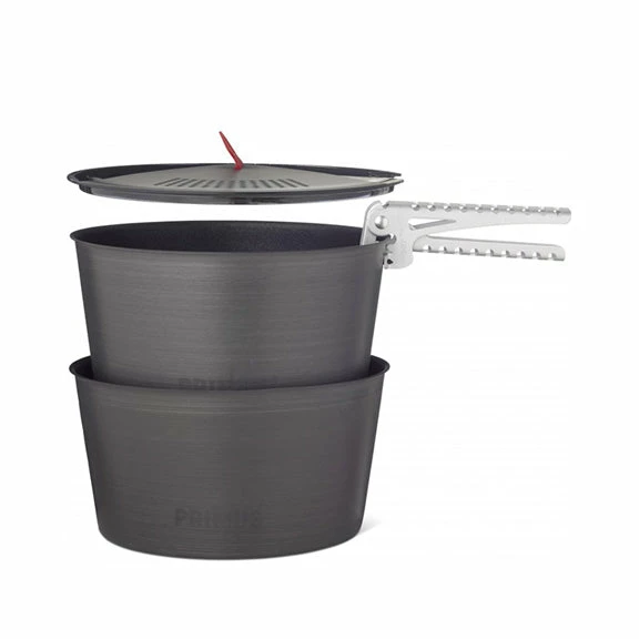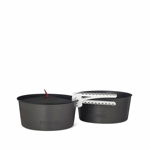 The pots are made of hard anodised and high grade aluminum, which gives you a robust set while keeping it at a low weight. Both pots have several layers of non-stick coating to make them as easy as possible both to use and clean. Make sure you do not use metal utensils in pots with a non-stick coating as doing so can destroy it. The pots can be stored into each other which creates a rattle free unit. The set comes with a lid that has an integrated strainer – ideal when you pour pasta water. It also includes tongs and a storage bag.