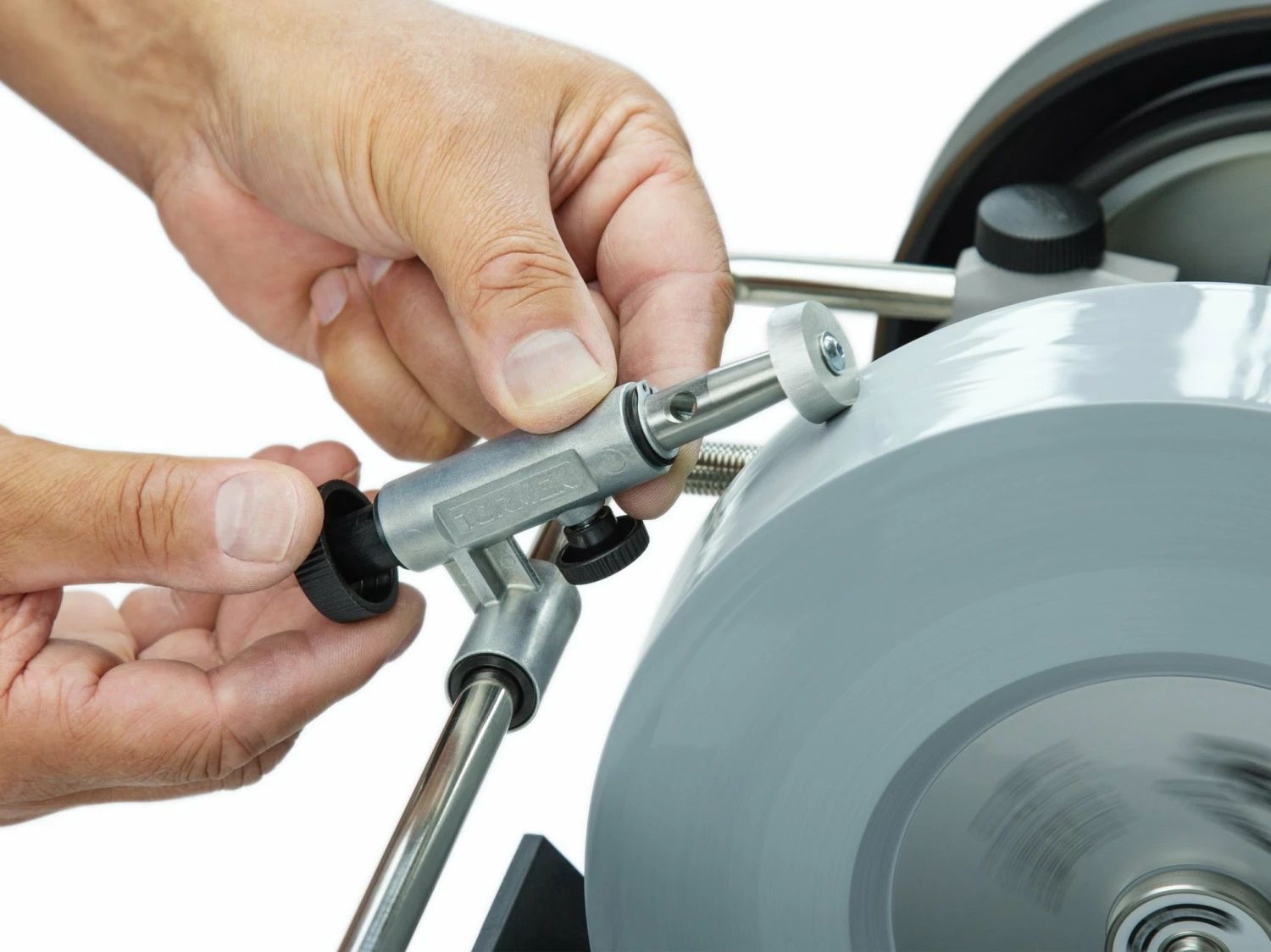 Thanks to the patented Turning Tool Setter TTS-100 you keep exactly the same shape and edge angle, making it easy to move from the bench grinder back to the Tormek. Getting the exact same angle. You get the best of two worlds with the same jig system – fastest steel removal and the sharpest edge possible!