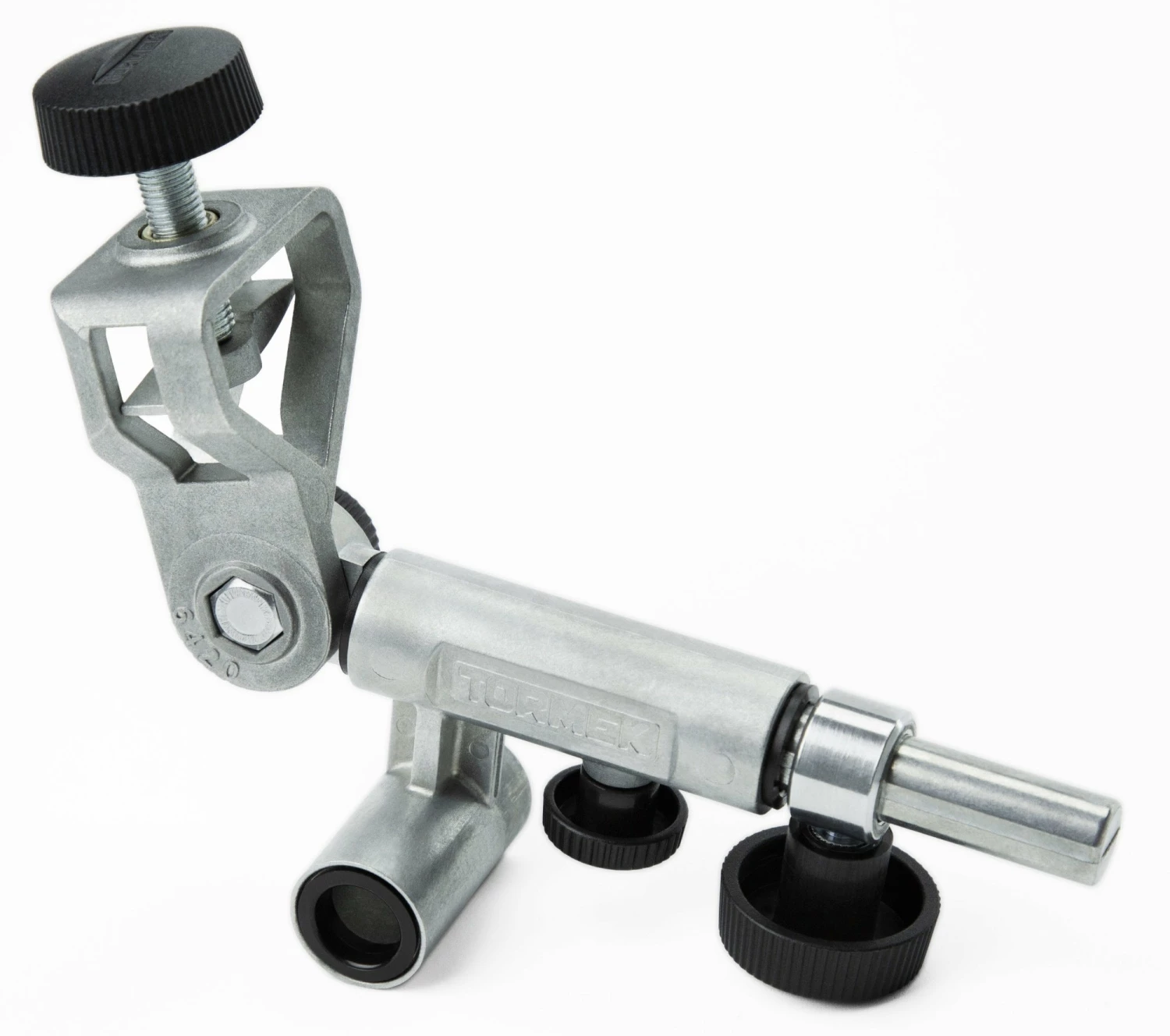 New locking screw to lock the Gouge Jig’s rotation. This new and additional locking screw allows you to fix the Gouge Jig ’s rotary movement at the required location. With this new feature, it will be easier to maintain full control when sharpening carving tools, such as V-tools. The locking screw also facilitates grinding to a completely flat bevel on violin making knives and chip carving knives when using the MB-100 Multi Base and Tormek Diamond Wheels.