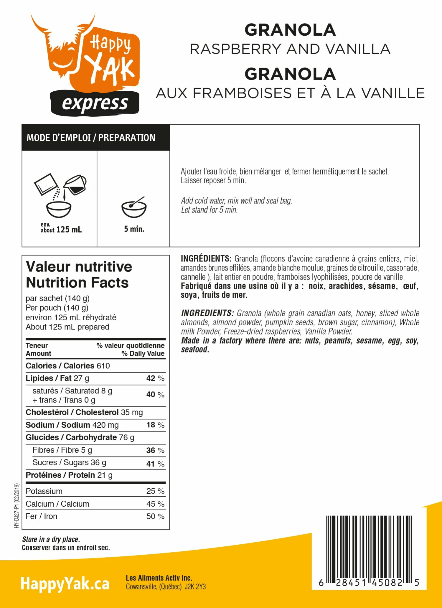 What could be better than the right mix of granola with freeze-dried raspberries! Simple and easy to prepare, this express and vegetarian meal contains 21g of protein.