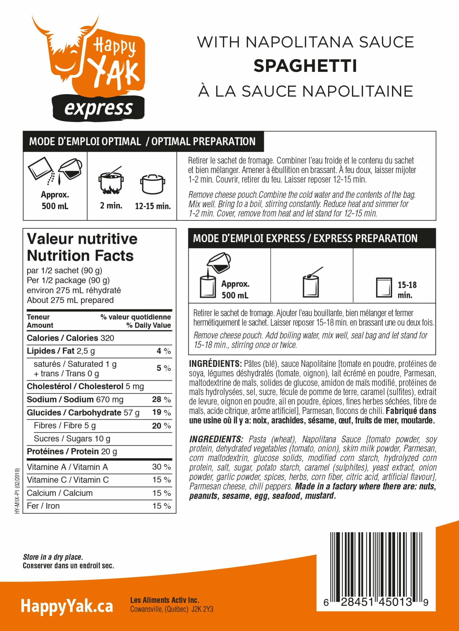 A generous portion of pasta with a tasty Neapolitan style tomato sauce. Enhanced with soy protein, sun-dried tomatoes and Italian herbs, this freeze-dried meal will be enjoyed by all on your next outdoor adventure.