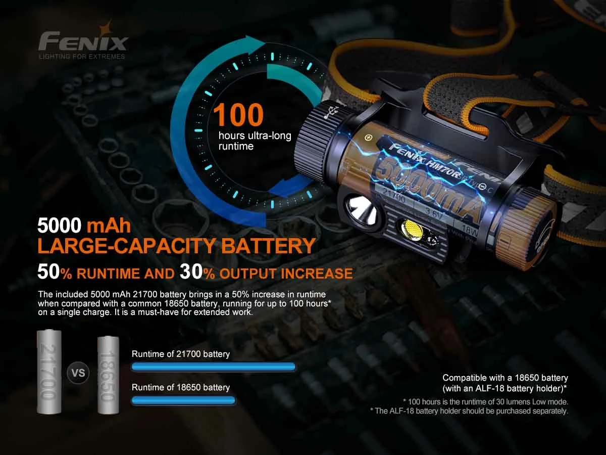 - Included a 21700 Li-ion battery, a 18650 Li-ion battery can be used as well (together with an ALF-18 battery holder).