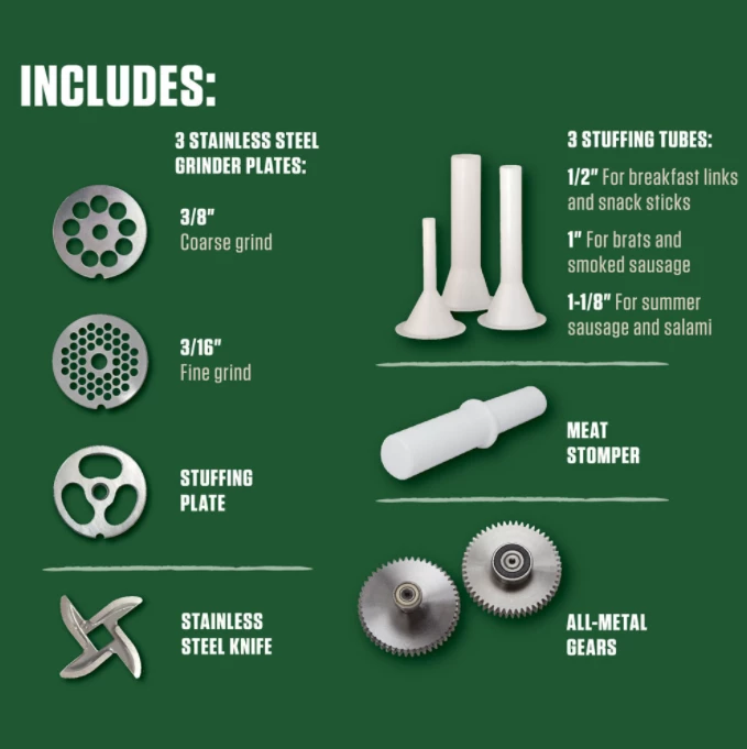 All stainless steel motor housing, all metal gears with roller bearings, heavy duty handle for easy moving, 110 volt, permanently lubricated motor with improved grease formulation to reduce motor noise, built-in circuit breaker, stainless steel knife, head, auger and large meat pan, stainless steel coarse (3/8 in) and fine (3/16 in) plates, 3 stuffing tubes (5/8 in, 1 in, 1-3/8 in OD), and meat stomper.