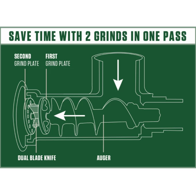 Save time with two grinds in one pass! Our New Dual Grind Meat Grinder can cycle through two grinds in a single pass. No more reloading for a second grind. This innovative technology has been used in commercial processing for years, and now we are bringing it to the home processing world! The secret is in the innovative design incorporating a unique double-edged knife and two grinder plates. The result is the quality and consistency of two separate grinds in just one pass. Combined with the Big Bite technology that allows the auger to take an extra big bite of meat and then move it through the grinder quicker than other grinders, you will get a premium grind in half the time!