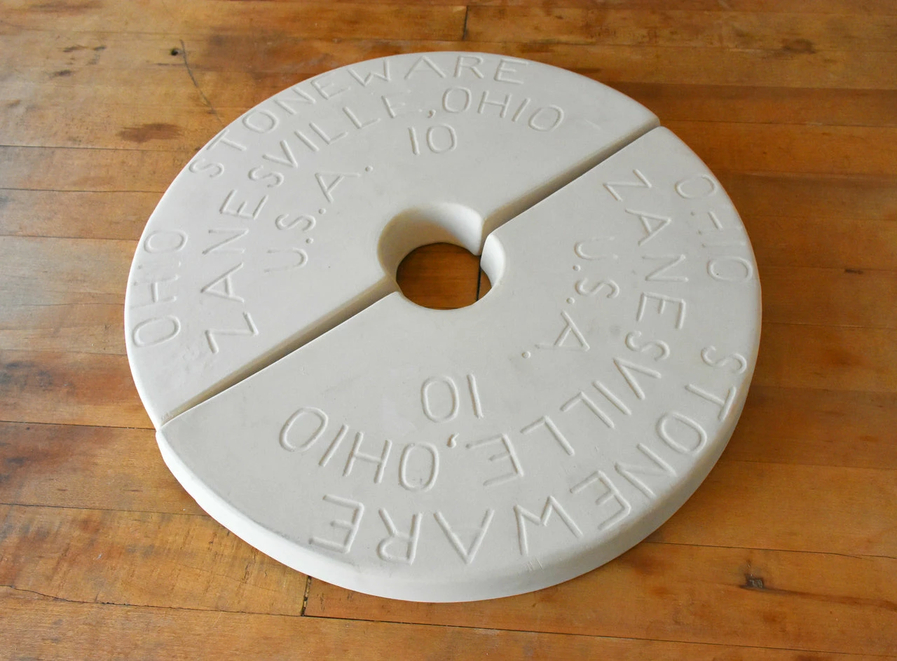 This weight set consists of two semi-circular stones designed to fit Ohio Stoneware’s Preserving Crocks. The weights are unglazed and used for food preservation. The stones rest on top of food inside of the crock to keep food in the brine for proper fermentation.