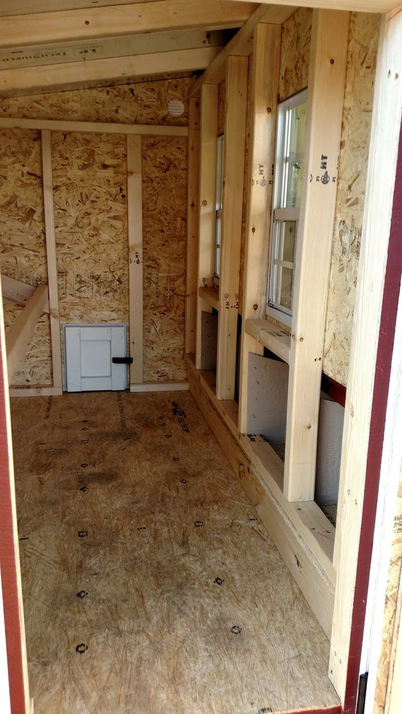 In addition, the ceiling has radiant barrier sheathing to keep the coop cooler in the summer heat. - All panels and trim are painted and assembled, all hardware is installed, doors and windows are installed, nesting boxes are assembled and metal is installed on the roof panel