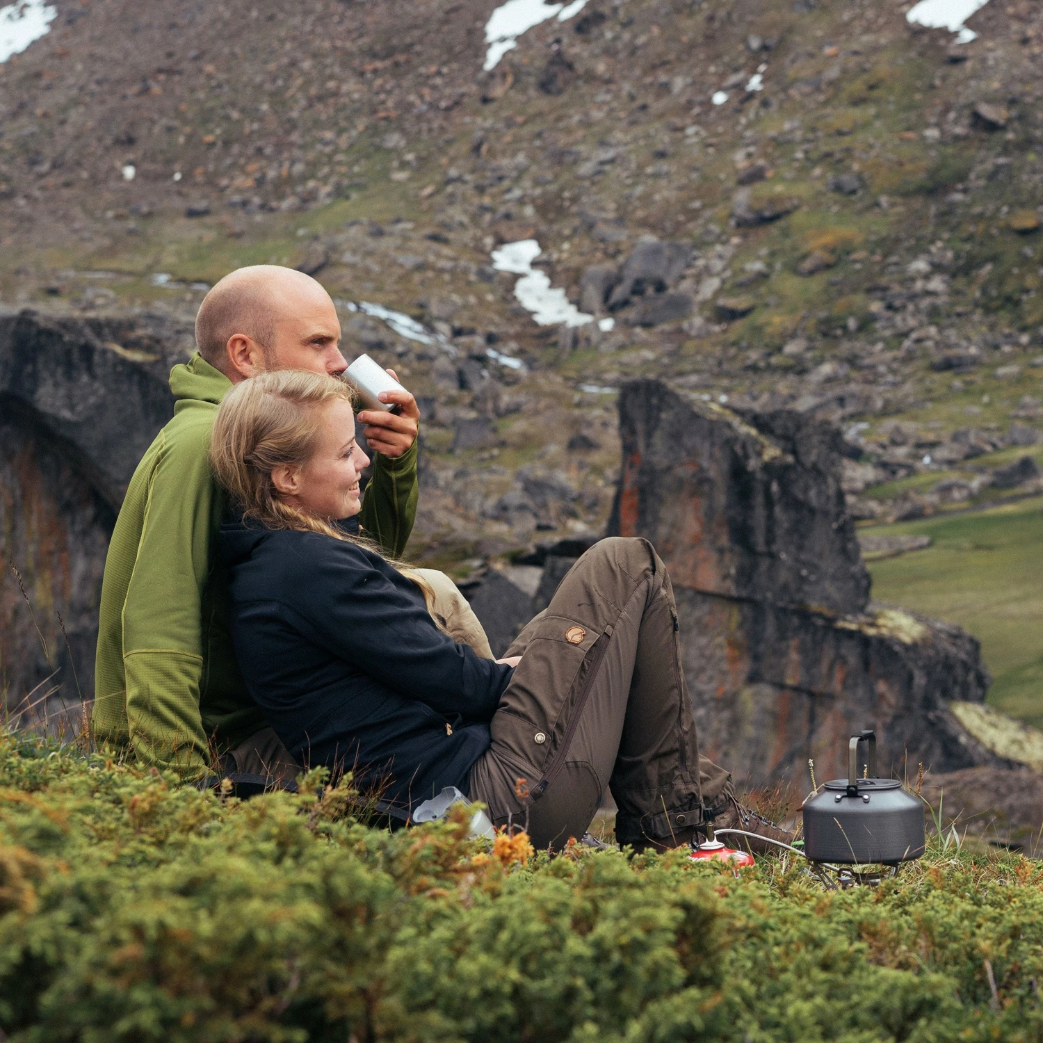 This lightweight coffee/tea kettle made of hard-anodized aluminum is a lovely attribute when camping. Folding handle. Comes in a practical net stuff sack.